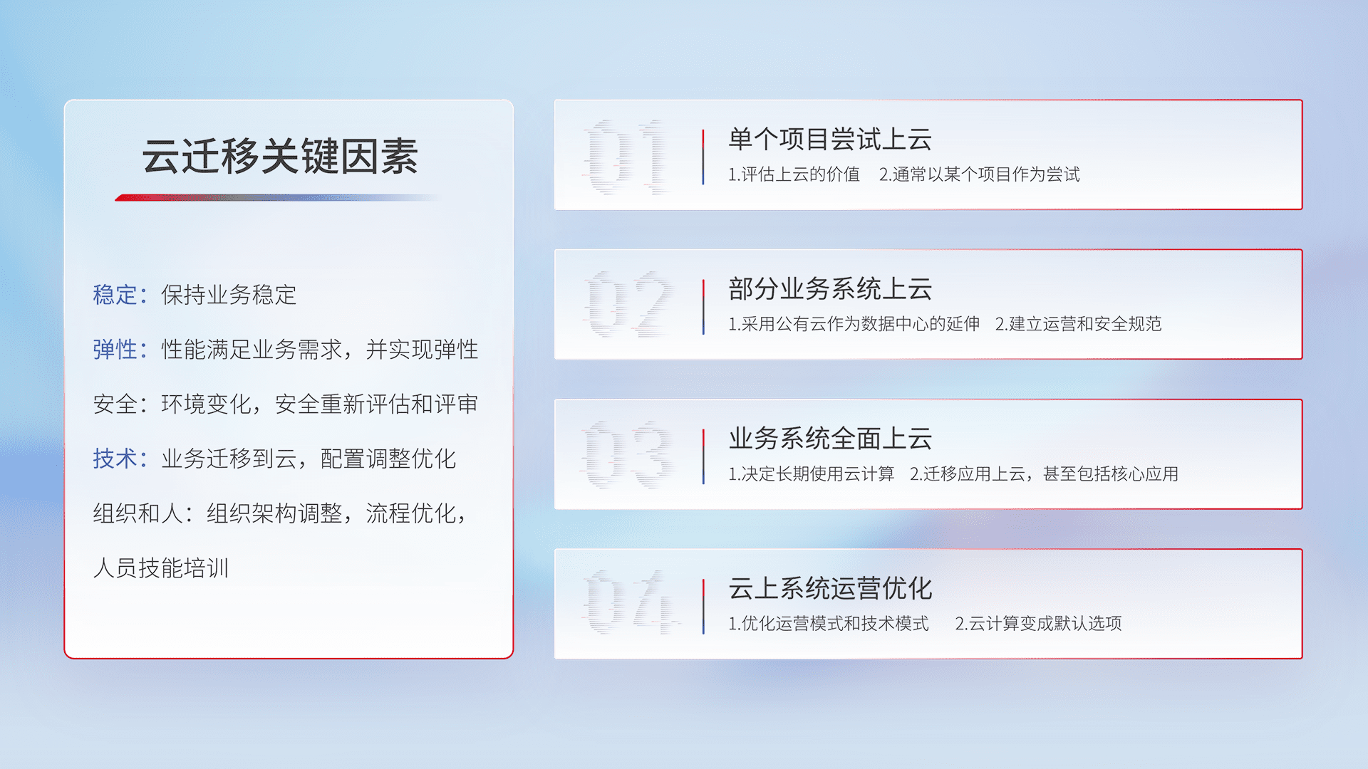 结合实际业务,,,从规划设计、、、、云平台选型、、云原生改造、、、、数据迁移、、、、集成交付,,,,迁移全过程为客户识别最佳上云路径,,,做好风险识别管理,,设计网络架构、、、身份权限、、安全审计合规、、、、操作审计、、日志审计、、、、监控告警策略、、、多站点容灾设计等,,,,对云上基础设施进行整体规划,,,提升IT治理水平,,,以满足弹性、、、高可用、、、、高性能的需求。。