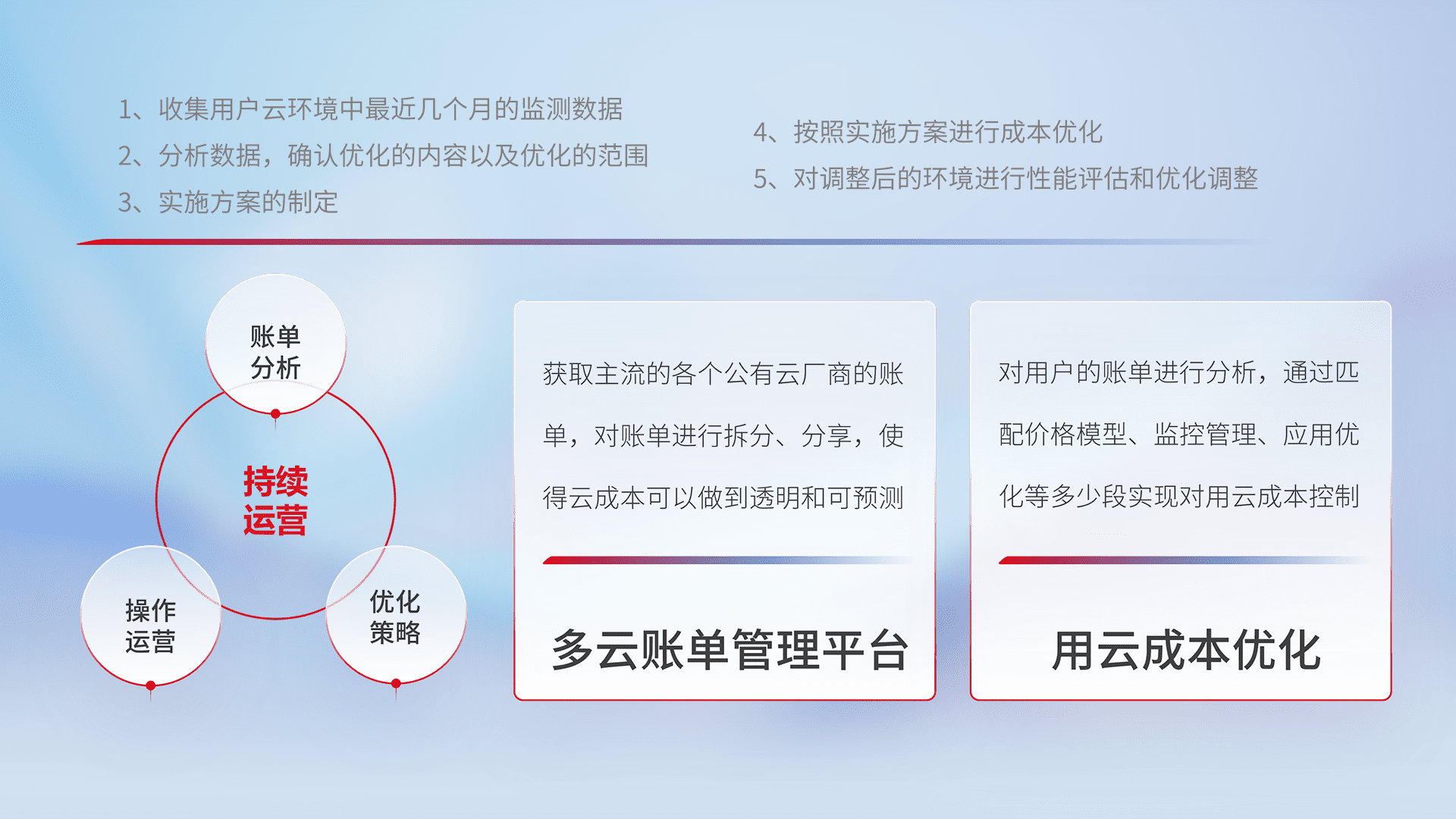 通过多云纳管,,以统一的资源数据模型把客户的云资源进行抽象和封装,,,,进而实现对多云资源的统一操作,,保障云资源管理的可靠性、、、、稳定性与可用性。。。量身定制化运维内容,,,,配置、、开发运维、、补丁管理、、、、备份、、监控、、、、认证和访问管理、、、审计和日常巡检等,,保障在用云过程中的可靠度,,,稳定度以及高可用率。。。